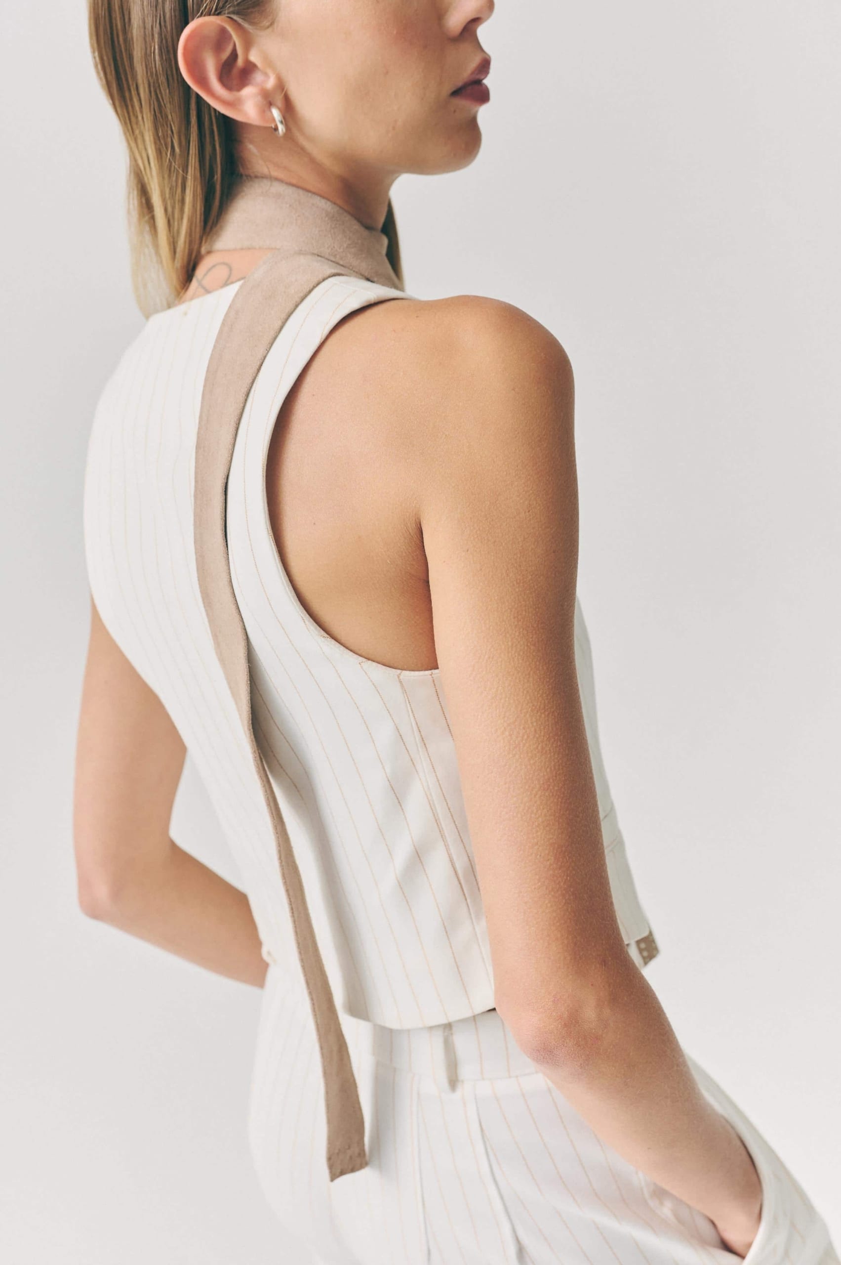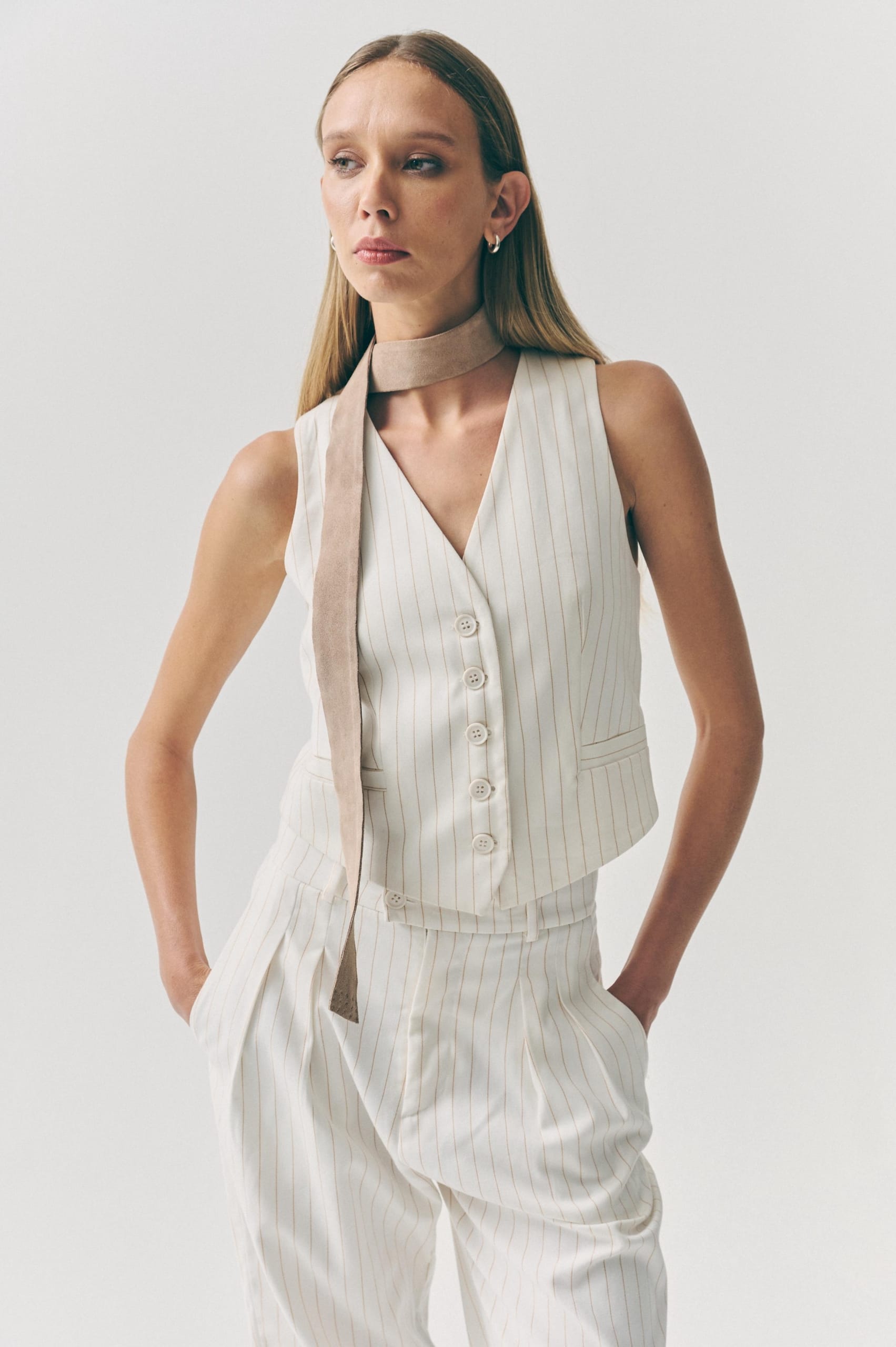 Confeccionado en gamuza italiana doble faz, detalle de tachitas de níquel con baño en plata en terminales.